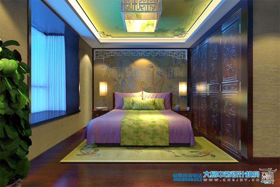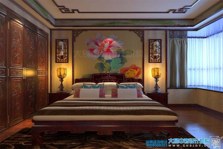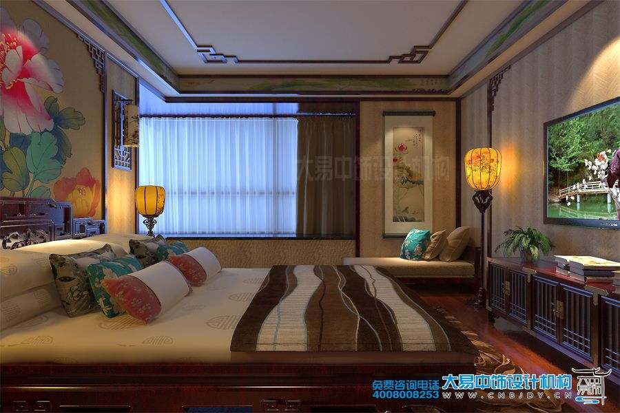 次臥裝修采用了中式風格,床頭背景墻上的中國水墨繪畫更是引人注目,表現出一種非凡的中華國畫的藝術感