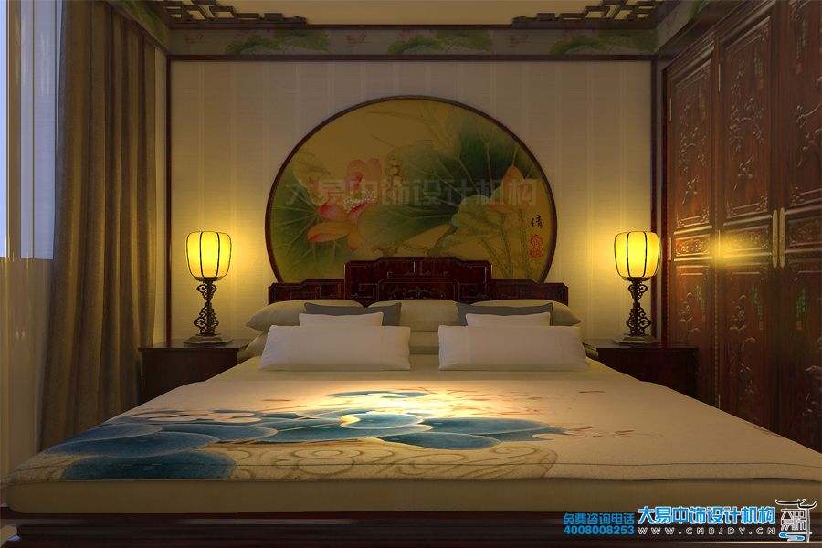 主臥室背景墻上的荷花水墨畫,沉淀著臥室優雅舒適的生活氛圍