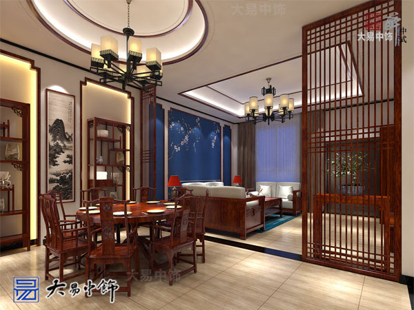 一層的餐廳和客廳在一個空間,中間用木格扇做為屏風(fēng)進行分隔。