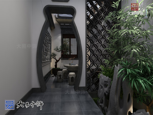 門廳中式裝修左側(cè)設(shè)置平安門和中式景窗,透過中式門窗看到第二層庭院景觀,營造出景中透景的設(shè)計(jì)層次感。