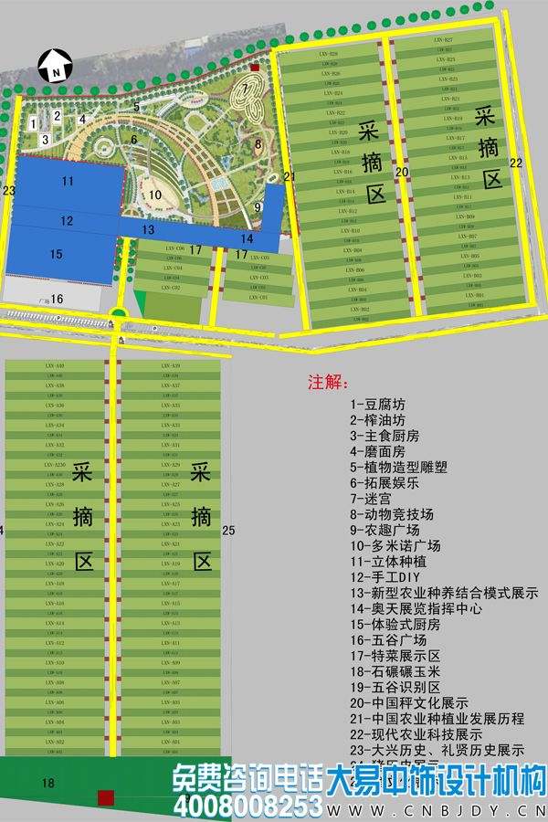 從大平面圖上,我們可以清楚的看到整個農(nóng)業(yè)科技體驗園的功能區(qū)域規(guī)劃。