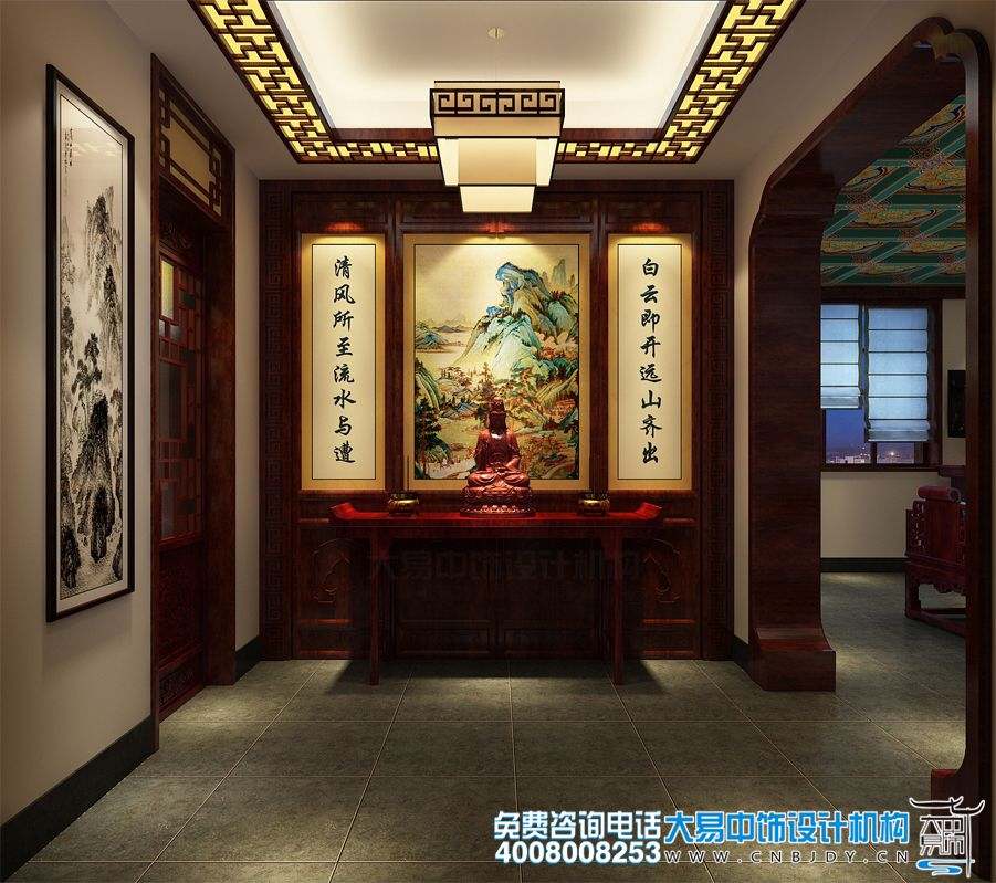 門廳接待處以條案載佛像,于無聲處散發著無限慈悲,淡淡禪意籠罩其間。大易中飾在玄關中式設計裝修中,選擇畫幅以自然風光取景,不僅具有生氣,給來賓給視覺美感,還可以給公司帶來財運。從對聯的選擇上,清風白云直抒胸臆,曠達淡泊,寧靜自如,彰顯美好吉祥的寓意同時也是企業形象的表達。