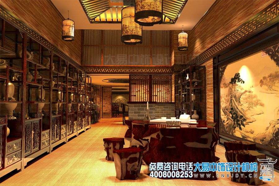 此為大易中飾設計推出的蓮花橋茶樓中式設計裝修案例,主色為灰色、淡黃,以中式壁紙、實木桌椅、書畫、掛屏等為飾,以竹元素為點綴,營造出新中式茶樓的自然清新格調。