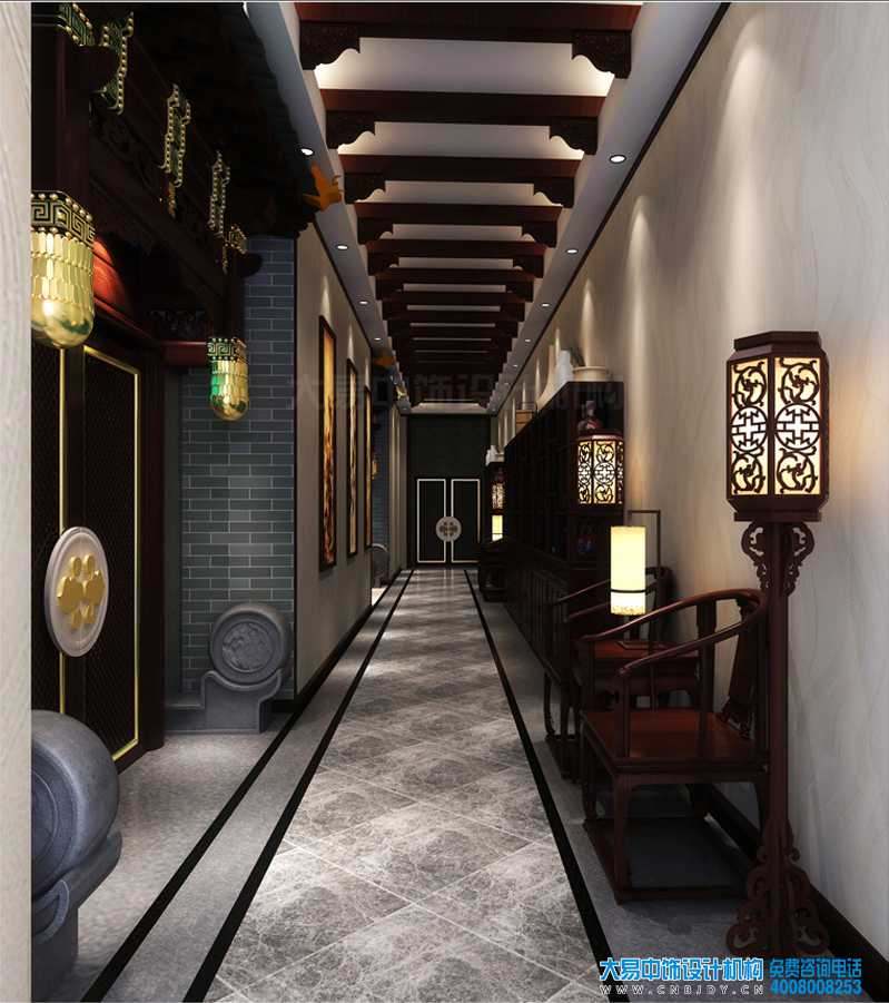 會(huì)所大堂中式設(shè)計(jì)裝修,背景墻以水墨丹青裝飾,八仙桌靜候佳友二三,青花瓷細(xì)心點(diǎn)綴綠意盎然。又以博古架為屏,與過(guò)廊相隔,幽然清靜,人間古韻了然于心。