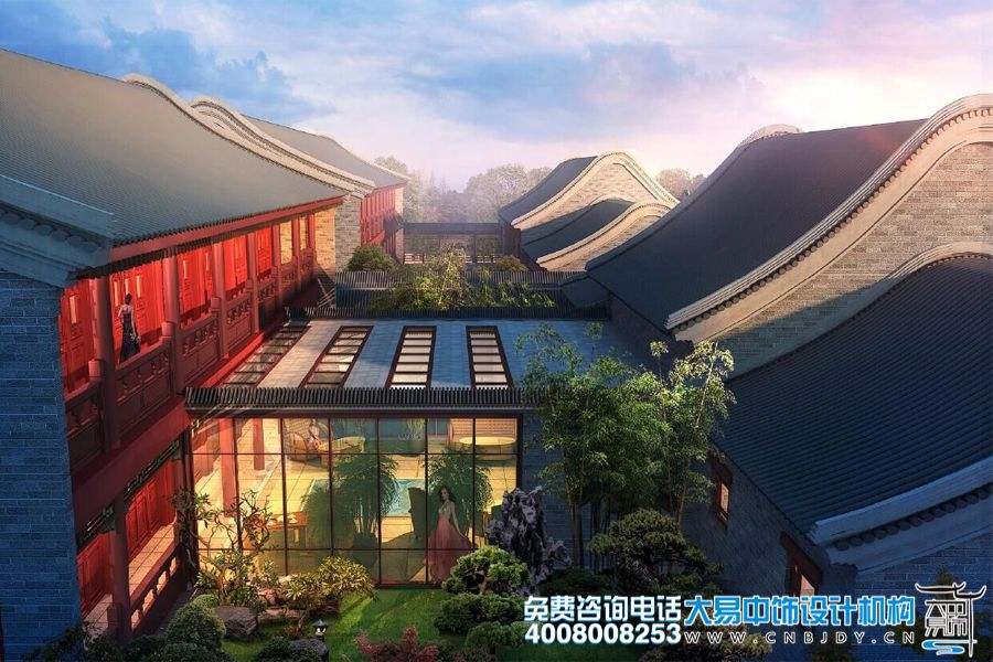 本套四合院中式設計裝修案例中是一個古典中式風格四合院設計規劃效果圖,因為四合院屬于我國古老、傳統的文化象征。所以,大易中飾設計師在規劃設計整個四合院建筑的時候,切合了原始的四合院構造造型以及大量的復古元素,加之與四周自然環境的糅合,更是應用到了古典廊柱、雕刻、水榭、亭臺設計,山借水景,水借山形,把深沉、濃郁的古典成分與現代裝飾技法協調一體,讓人有種步入仙境般的神奇景象,最具美感的藝術魅力,更能凸顯古典中式風格的文化深度。