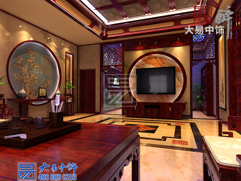 客廳背景墻的裝修采用圓形裝飾,正對應側邊圓形花束圖,實現中式裝修左右對應的布局裝修。