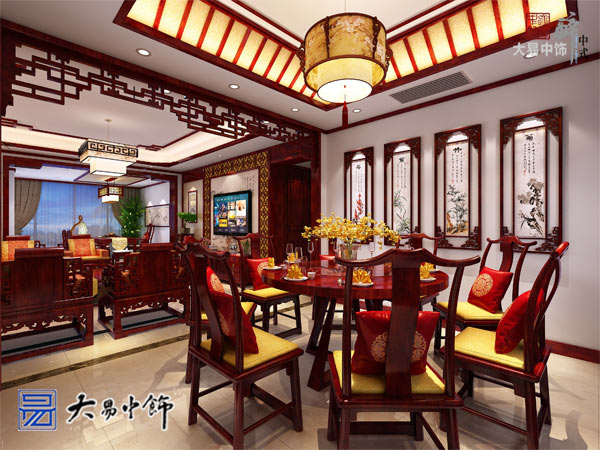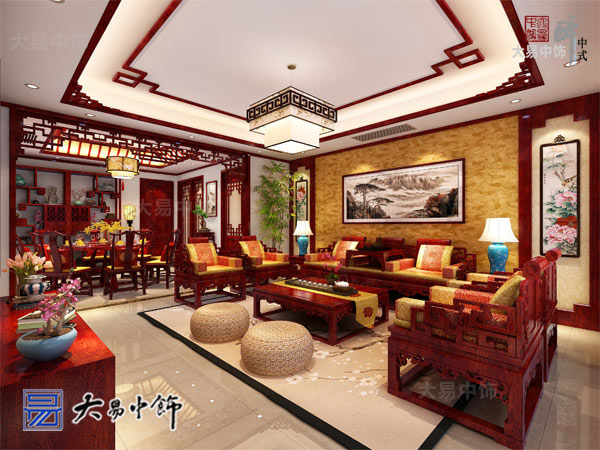 客廳中式裝飾通過(guò)簡(jiǎn)單的吊頂來(lái)體現(xiàn)中式氛圍.客廳沙發(fā)背景墻采用黃色祥云紋壁紙將紅酸枝家具襯托的更加高貴典雅。