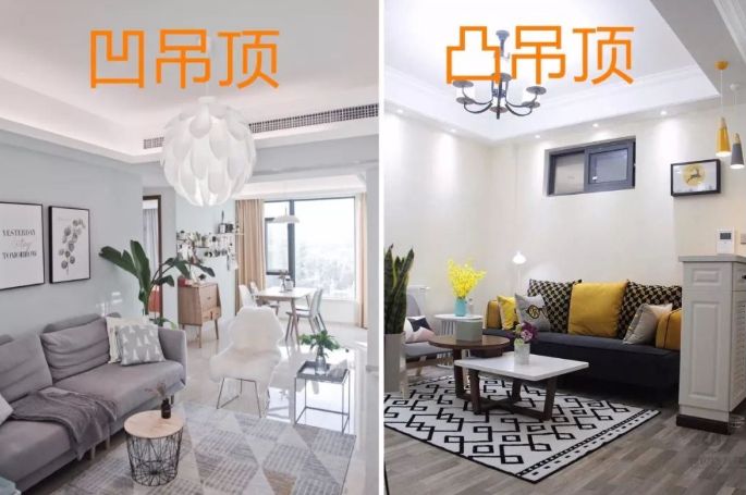 外觀區別:凹吊頂的造型就像凹字形的外觀;而凸造型就是向外凸起的。